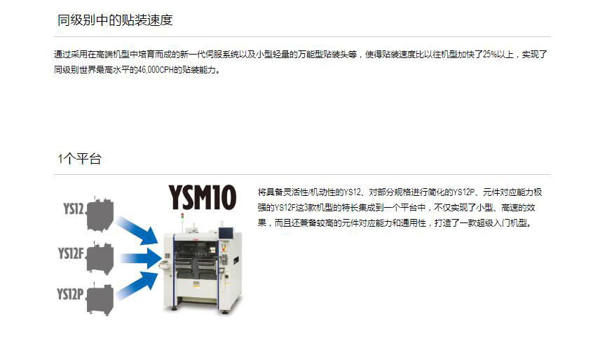 YSM10 小型高速模塊貼片機(jī)1.兼?zhèn)涓咚傩院屯ㄓ眯?、在同級別機(jī)型中實(shí)現(xiàn)更高水平貼裝能力的YSM系列入門級貼片機(jī)。2.以三個“1”為特征、達(dá)到極致的基礎(chǔ)型貼片機(jī)。3.可靈活支持各種生產(chǎn)現(xiàn)場。4.可確保穩(wěn)定生產(chǎn)的各項(xiàng)功能。