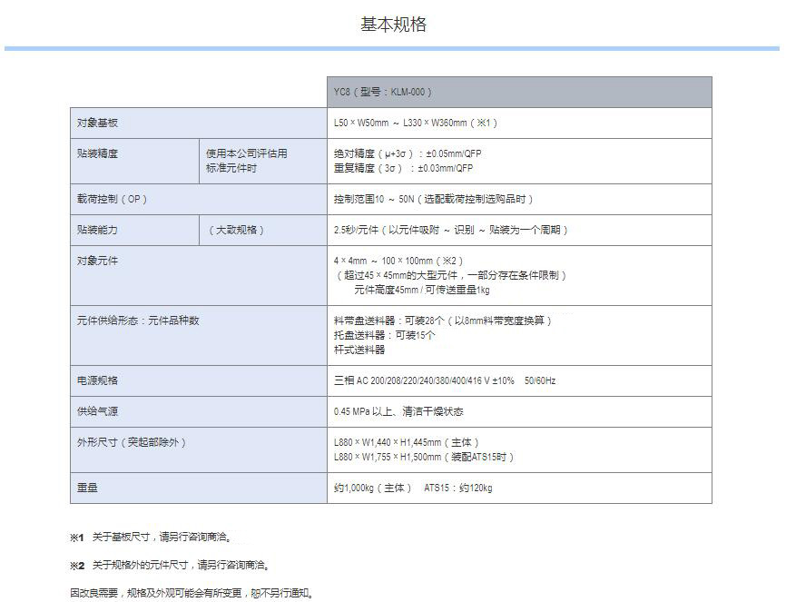 YC8 支持大型、不規(guī)則元件的小巧型模塊式貼片機 1.可貼裝較大尺寸達100mm×100mm、高達45mm的元件。2.支持貼裝重達1kg的元件,還具備壓入元件的功能。3.機身僅寬880mm的小型化設(shè)計,可大限度地有效利用空間。4.支持可裝15張托盤的自動更換式托盤供給裝置 ATS15。5.支持SS型電動送料器與ZS型電動送料器。