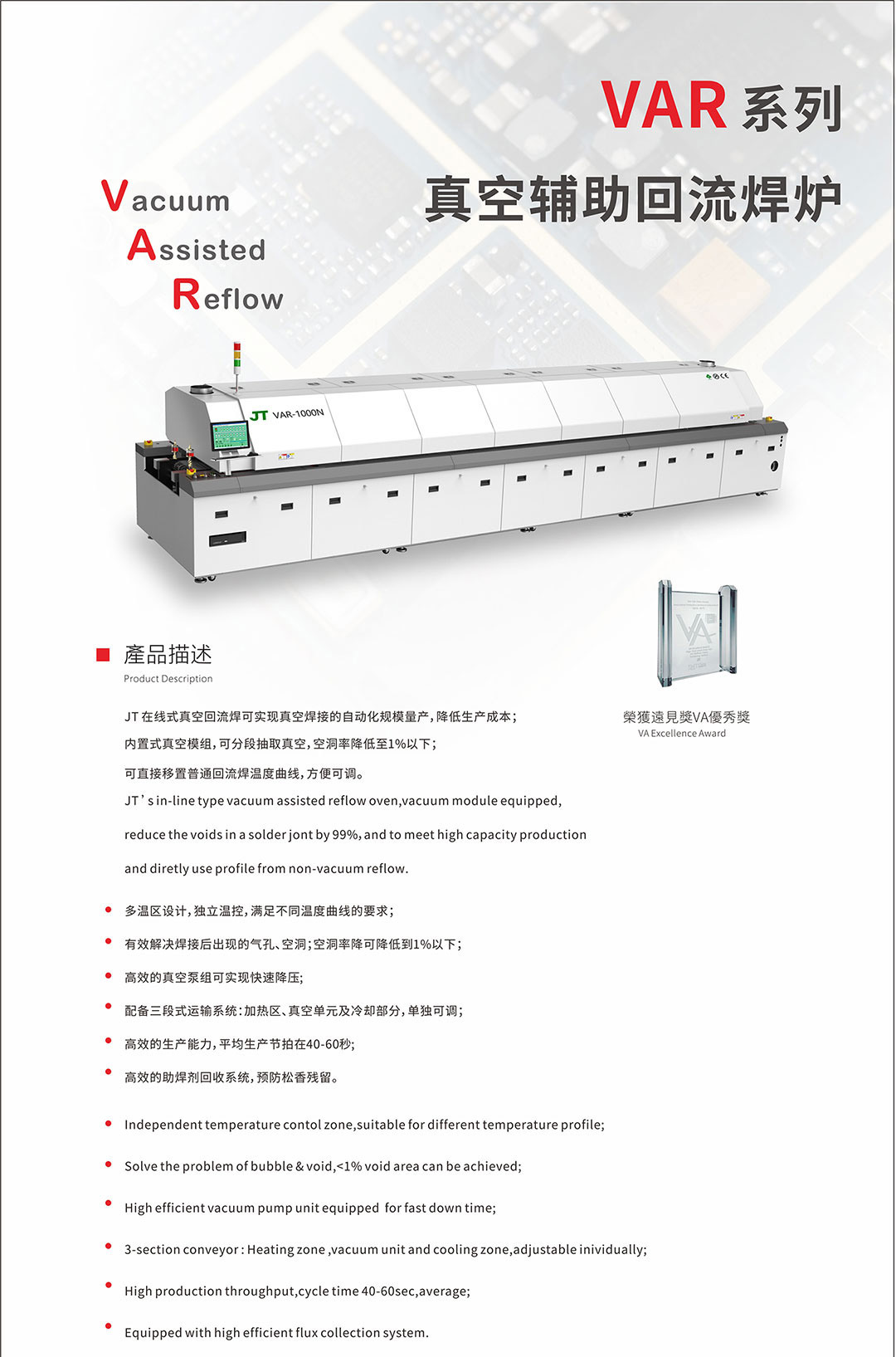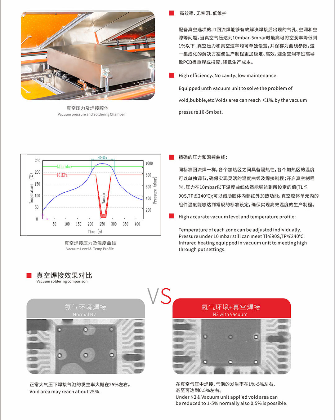 在線式真空回流焊可實(shí)現(xiàn)真空焊接的自動(dòng)化規(guī)模量產(chǎn),降低生產(chǎn)成本; 內(nèi)置式真空模組,可分段抽取真空,空洞率降低至1%以下; 可直接移置普通回流焊溫度曲線,方便可調(diào)。